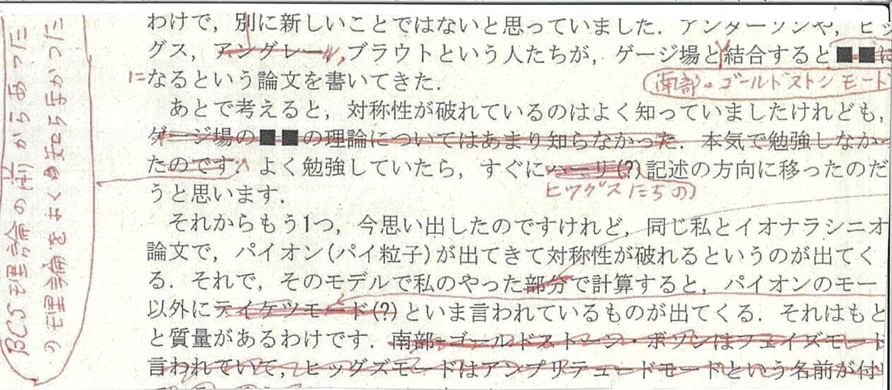 2004年11月15日になされたインタビュー(岩波主催)の校正原稿(2005年1月23日付)。聞き手は和達三樹。アインシュタインとの出会い、プリンストンでの日々、パイスとのやりとり、物性論と素粒子論、超伝導理論と自発的対称性の破れ、カラーの導入やひも理論、物理の黄金時代の変遷、独自性と楽観主義のすすめなど、興味深い話が語られる。 (OU-essay-B6, 19 pages)