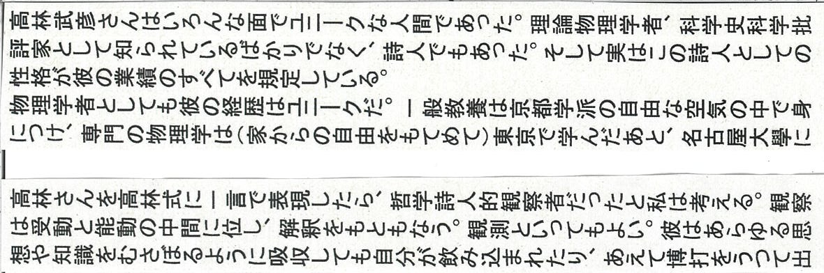 高林武彦氏自叙伝の序文として書いた南部の原稿。日付は2000.4.19。南部は「高林さんを高林式に一言で表現したら、哲学詩人的観察者だった」と述べる。美しい回想文。(OU-memoir-D5, 2 pages)
